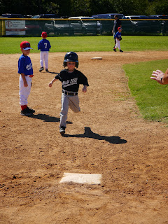 Noah's team tied today. My assistant coach couldn't make it unfortunately. So I was running the team on my own. A bunch of the parents helped out which was nice. Noah did very well at the plate. During warmups I saw that he was hitting the ball hard and very well. I thought he might have a good game. Twice he hit the ball into the outfield. He ran well. He made a couple plays at pitcher and a few more at second base.